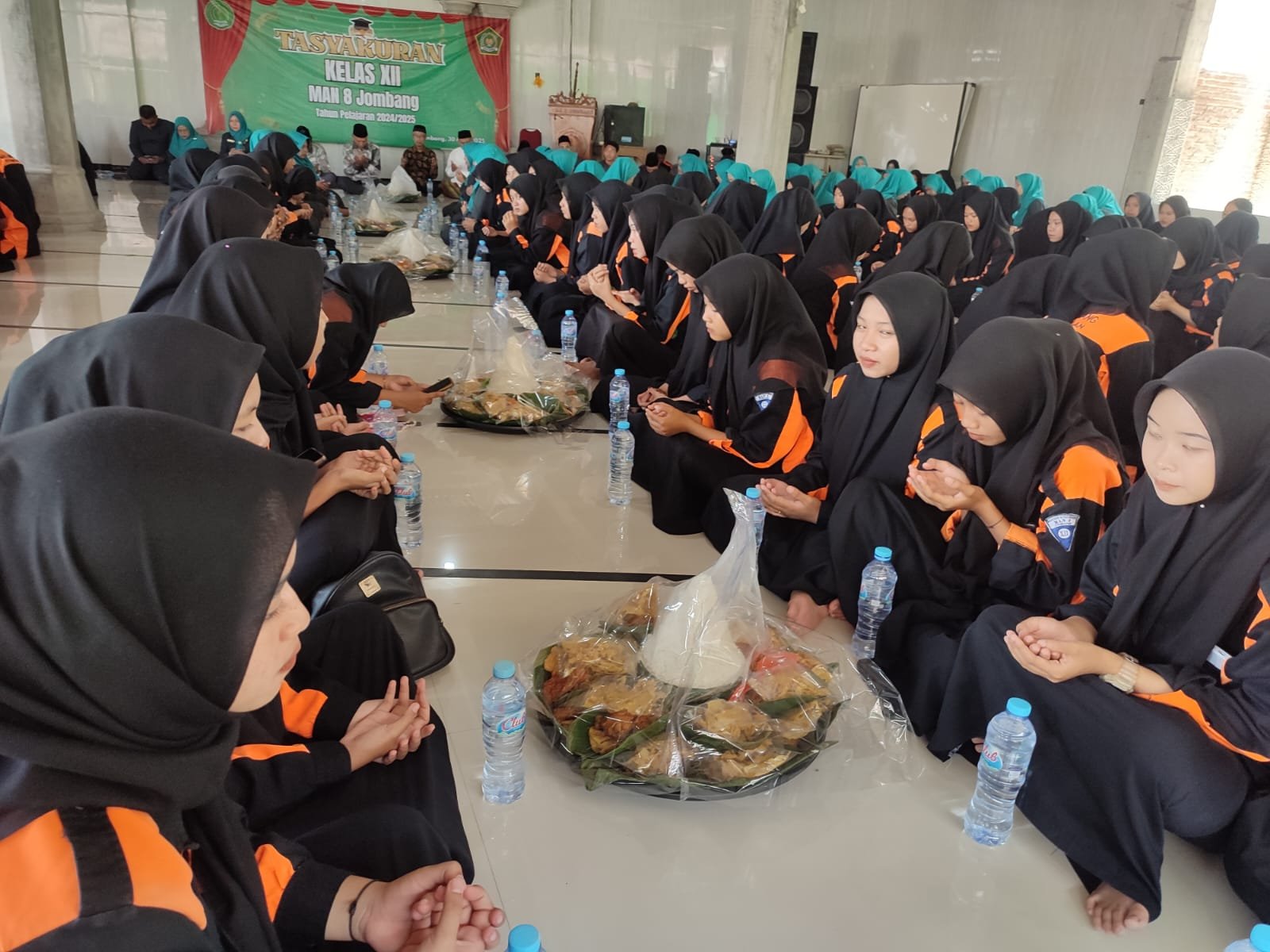 Jombang, 30 April 2025. Madrasah Aliyah Negeri (MAN) 8 Jombang menggelar acara tasyakuran untuk siswa-siswi kelas XII pada hari Rabu, 30 April 2025. Acara yang berlangsung di halaman madrasah ini dihadiri oleh seluruh siswa kelas XII, para guru, wali murid, dan staf madrasah. Suasana haru bercampur bahagia mewarnai momen perpisahan yang menjadi penanda akhir perjalanan mereka di jenjang pendidikan menengah atas.