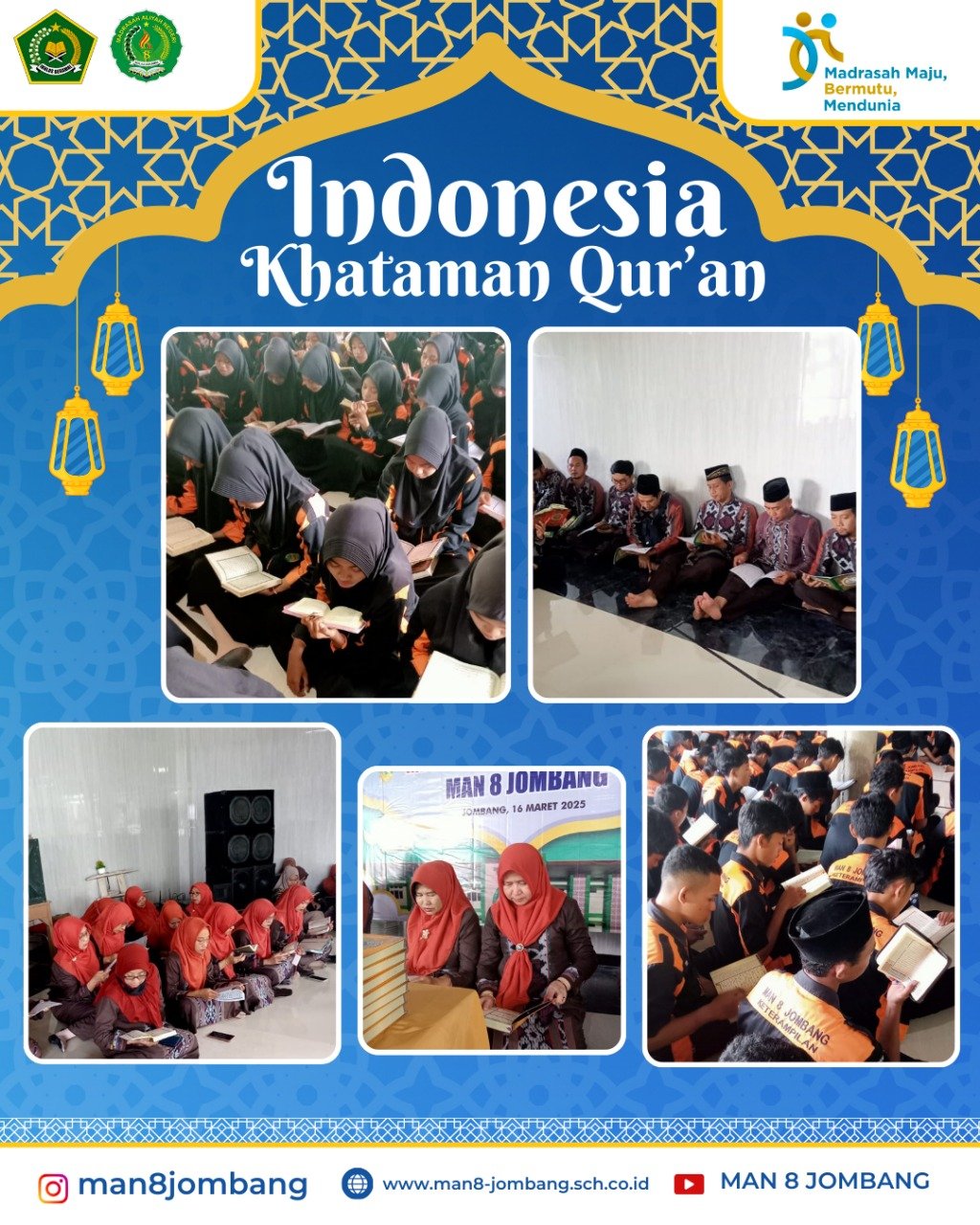 Jombang, 16 Maret 2025 – Madrasah Aliyah Negeri (MAN) 8 Jombang menggelar acara khataman Al-Qur’an yang melibatkan seluruh siswa dan guru, pada hari Ahad, 16 Maret 2025. Kegiatan ini merupakan bagian dari upaya madrasah dalam memperkuat pemahaman dan kecintaan terhadap Al-Qur’an di kalangan civitas akademika.