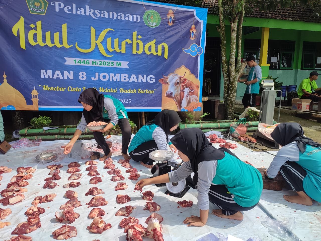 Pada tahun ini, MAN 8 Jombang menyembelih satu ekor sapi dan kambing merupakan gotong royong guru, staf, dan sebagian wali murid. Proses penyembelihan dimulai pukul 07.00 WIB dan disaksikan langsung oleh para siswa, guru, serta warga sekitar yang turut hadir.