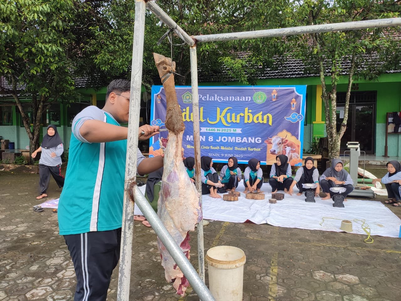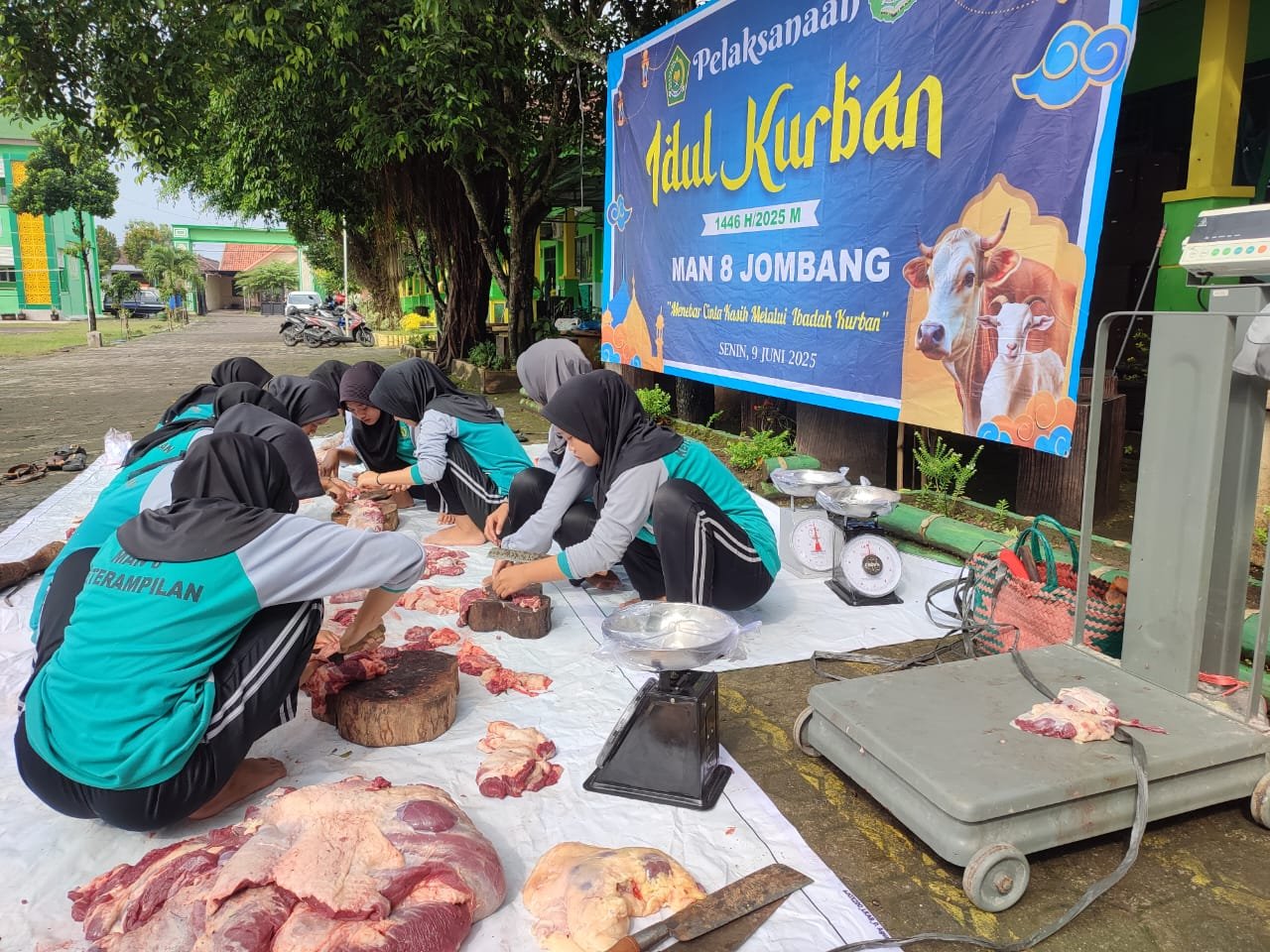 Jombang, 9 Juni 2025 – Dalam rangka memperingati Hari Raya Idul Adha 1446 H, MAN 8 Jombang melaksanakan kegiatan penyembelihan hewan qurban yang berlangsung pada Senin (9/6) di halaman depan madrasah. Kegiatan ini menjadi agenda rutin tahunan sebagai bentuk implementasi nilai-nilai keagamaan serta semangat berbagi kepada sesama.